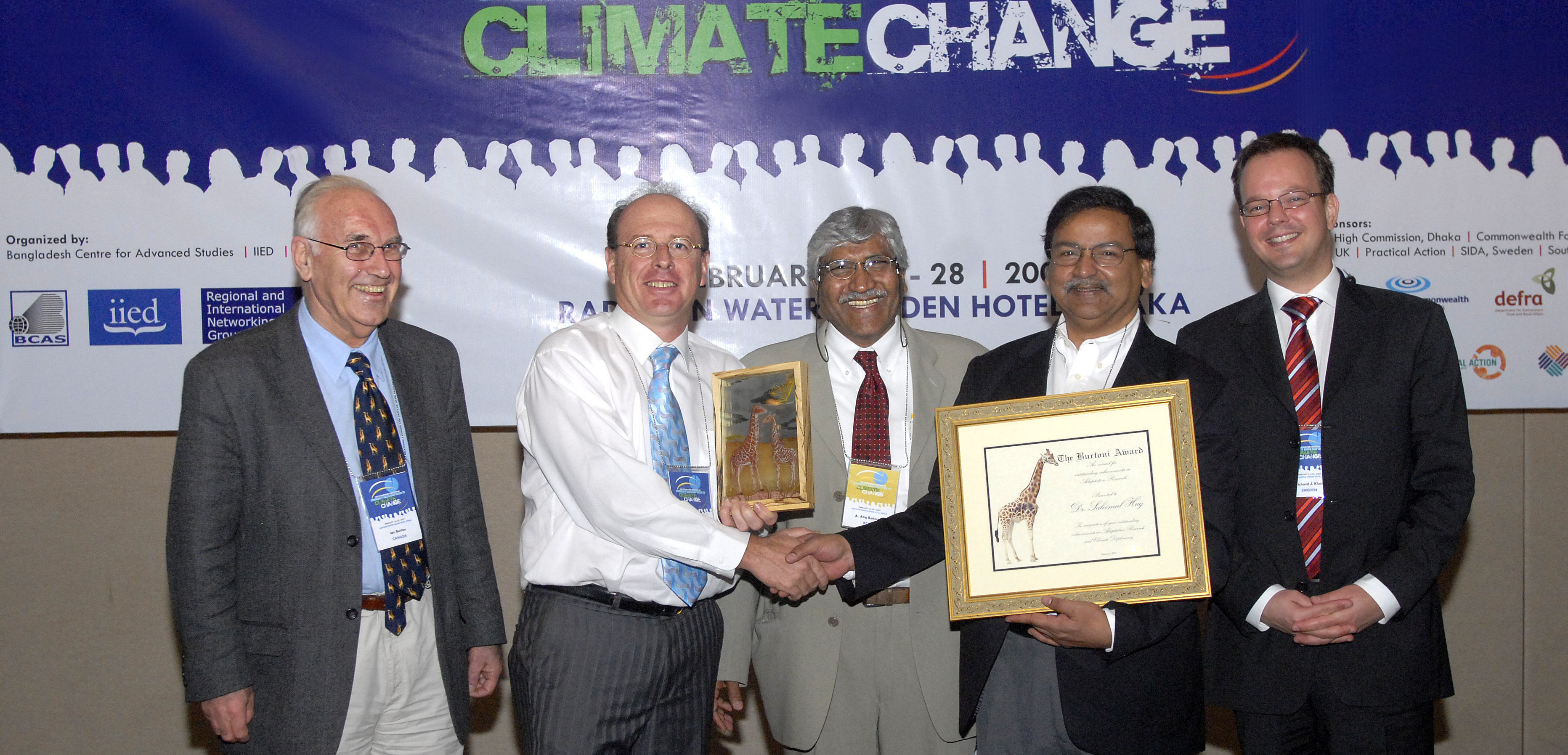 Conference organiser Saleemul Huq receives the "Burtoni" award: from left to right: Ian Burton (IPCC lead author), Roger Jones (CSIRO), Atiq Rahman (BCAS), Saleemul Huq (IIED) and Richard Klein (SEI) (Photo: IISD)