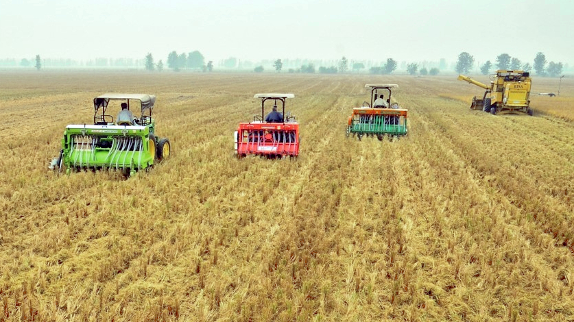 Combine harvesters in a wheat field in India’s Punjab region. Just four crops – rice, wheat, maize and potatoes – provide more than 60% of the world’s food (Photo: Borlaug Institute for South Asia, via Flickr, CC BY-NC-SA 2.0)