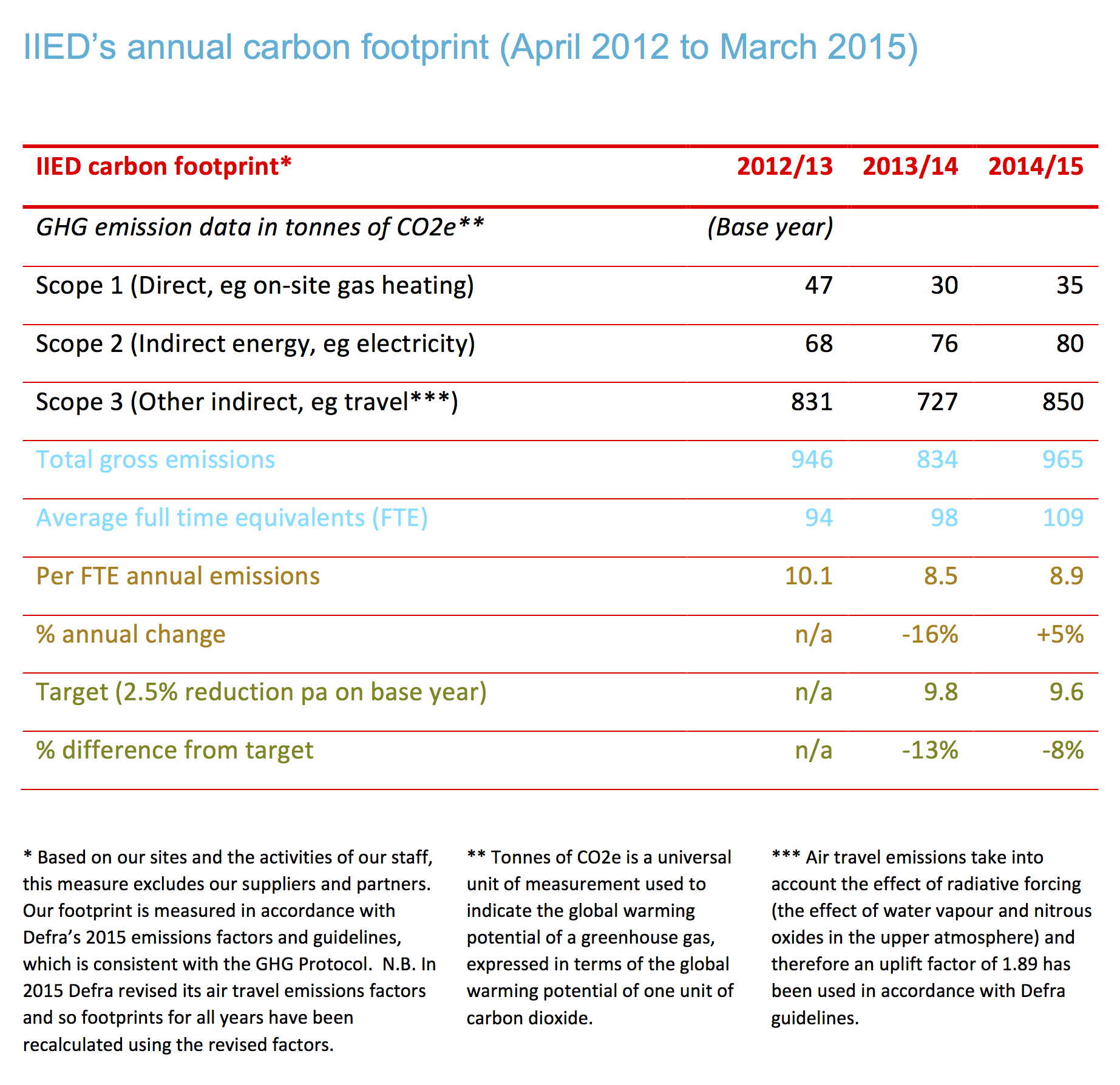 Despite an increase in our absolute carbon footprint, in 2014/15 we were well within our overall target of reducing emissions by 2.5 per cent per year, per head.