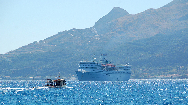 A fishing boat and cruise liner cross paths outside Zakynthos Harbour (Photo: Robert Wallace, Creative Commons, via Flickr)