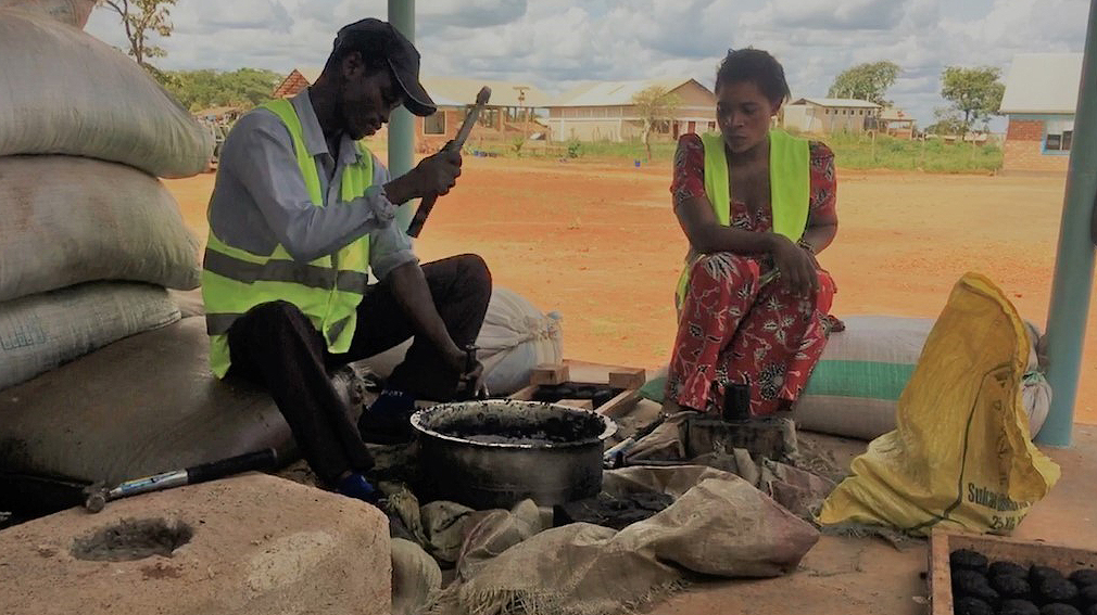 Colleagues at Good Neighbors Tanzania fabricate briquettes in Nyaragusu Camp, May 2019 (Photo: Kevin Johnstone)