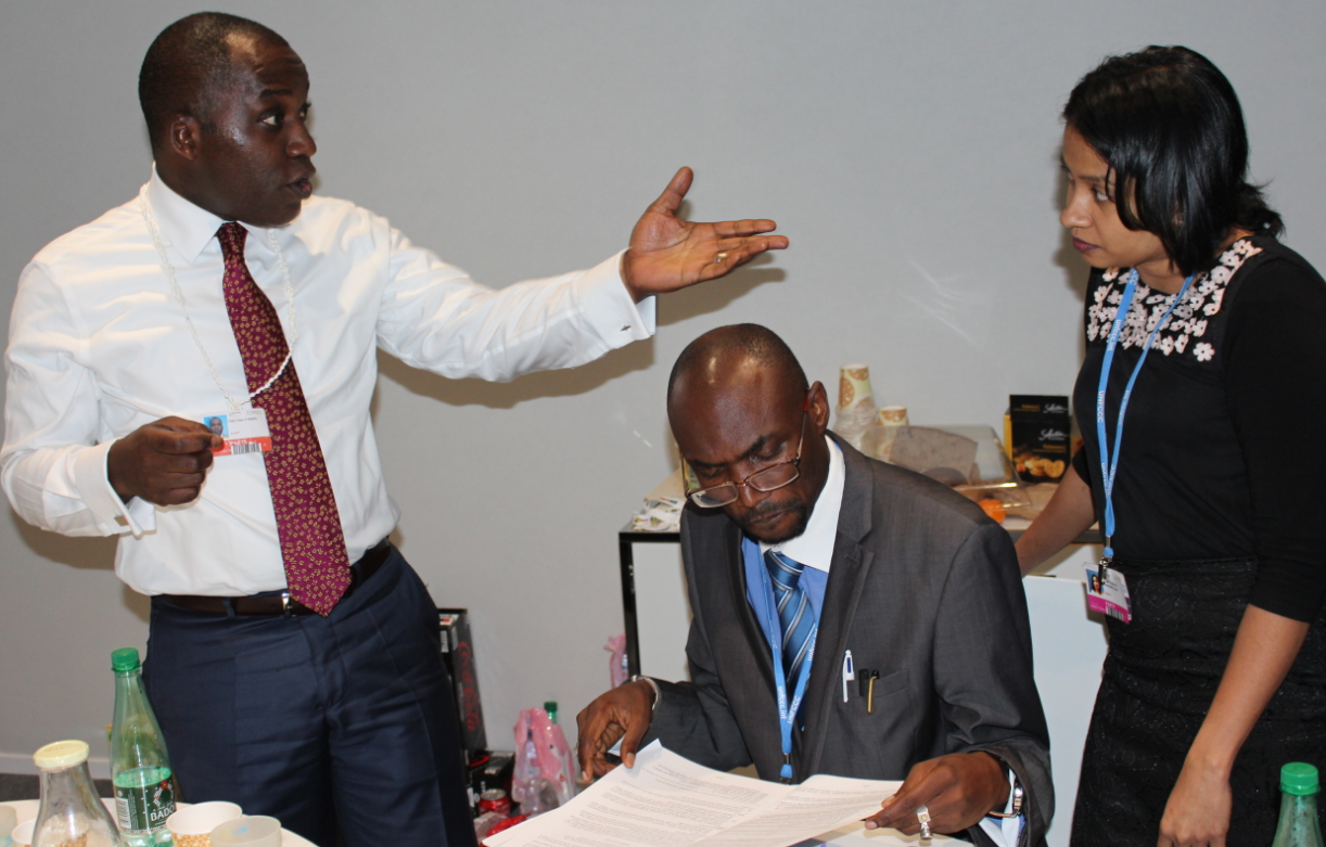 Former LDC Group chair Giza Gaspar-Martins, left, discusses the formulation of the Paris Agreement with IIED's Achala Abeysinghe, right, at COP21 (Photo: Matt Wright/IIED)