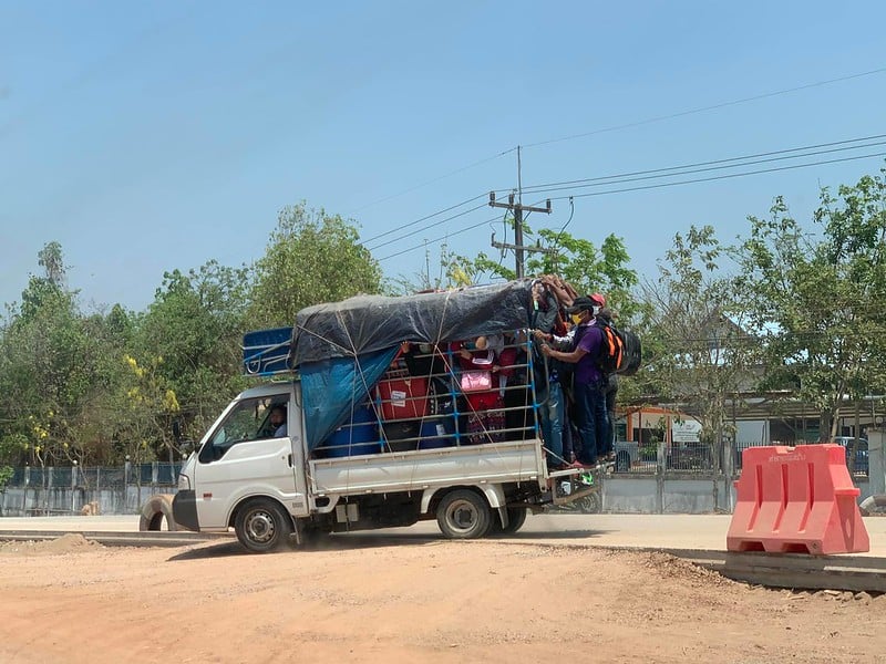 Workers from Myanmar wait to cross the border at border with Thailand in 2020. Climate change puts displaced people at a higher risk of trafficking, but more research is needed to understand this relationship (Photo: Prachatai via Flickr, CC BY-NC-ND 2.0)