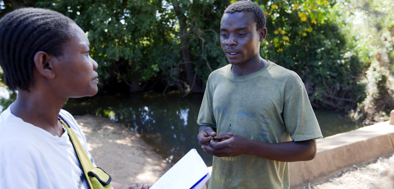 A researcher talking with a cotton farmer in Mozambique. Communicating our findings to a wide range of key audiences is central to our work (Photo: Copyright Mike Goldwater)