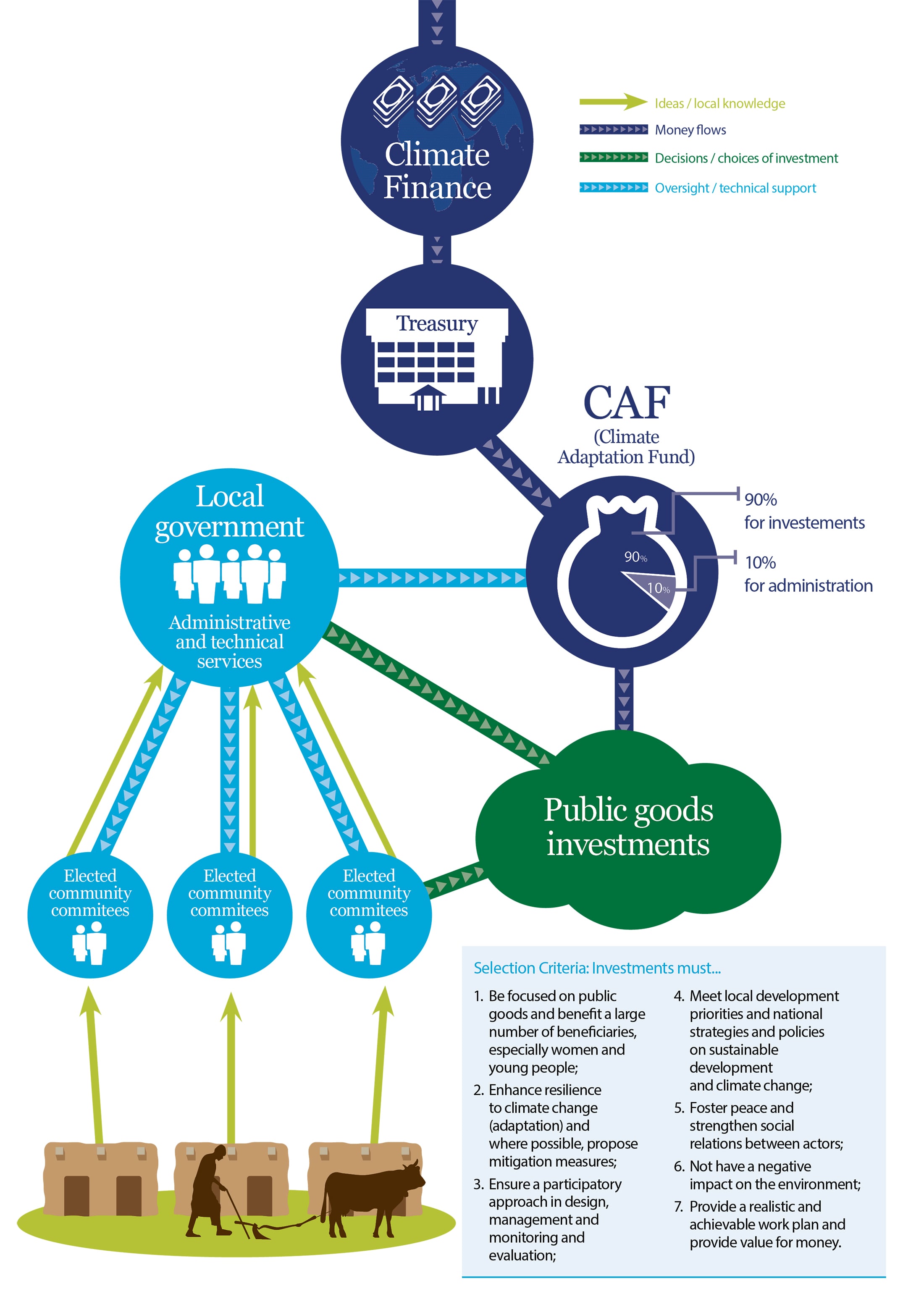 The DCF mechanism offers an innovative model for investing in public goods at the local level and building enabling environments for sustainable and climate-resilient livelihoods. It aims to bridge bottom-up, flexible, local and often customary planning with formal planning and budgeting processes, integrated at both national and local levels.