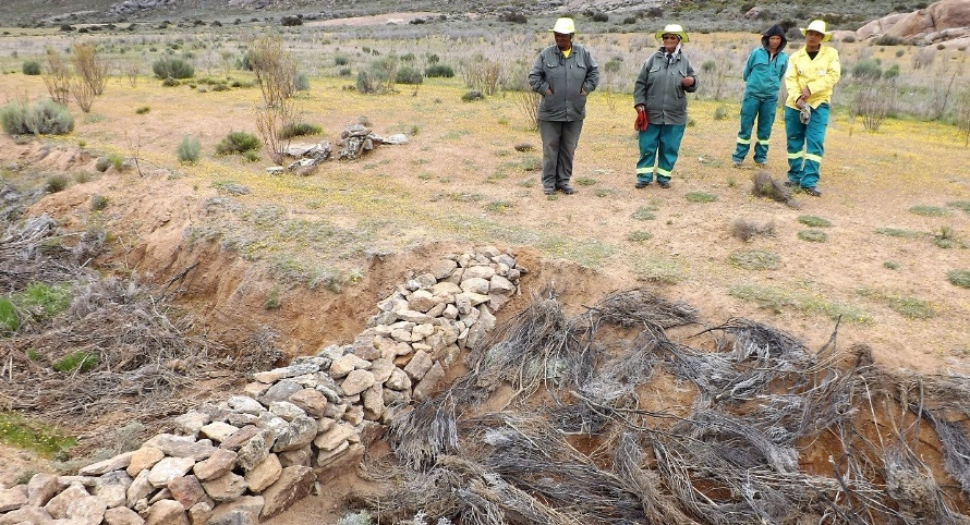 A stone gabion constructed to control erosion across a gully in the Namaqualand region. (Photo: copyright Halcyone Muller/Conservation South Africa)