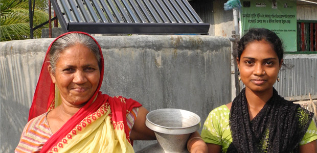 Collecting water from a solar-based purification system supplied by CAFOD. Chila Union, Mongla District, Bangladesh. Photo: Photo: Paula Nyunt / CAFOD