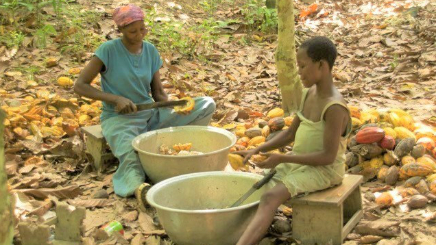 Ghanaian women working in a micro enterprise shell cocoa, one of the commodities driving deforestation in western Ghana. These enterprises need targeted access to finance to adopt sustainable production systems that can contribute to halting deforestation and improving livelihoods (Photo: Tom Blomley)