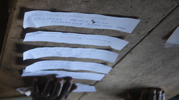 A focus group ranks in order motivations for unauthorised resource use as part of the R2P research, at Bwindi Impenetrable National Park, Uganda (Photo: Mariel Harrison)