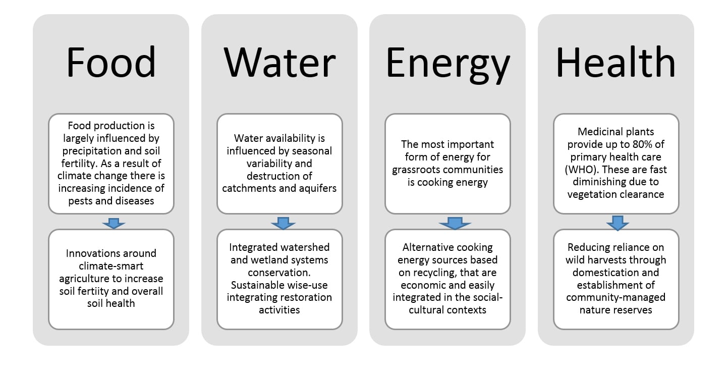 To cope, communities need access to food, water, energy and healthcare (see the diagram below). The field visits will highlight community efforts around these key determinants of community resilience in rural populations in Uganda.