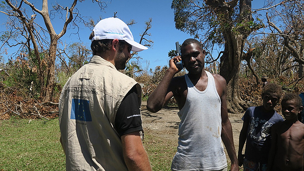 A satellite phone provided by Télécoms Sans Frontières, with European Commission funding, enables a man from Tanna island to finally talk to loved ones ten days after communications were cut off by Cyclone Pam in March 2015 (Photo: TSF, Creative Commons, via Flickr)