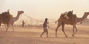 Man walking with two camels over a sandy landscape. Credit: Curt Carnemark / World Bank, CC BY-NC-ND 2.0