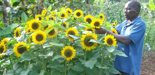 Smallholder flower grower in Thika, Kenya trialling a new variety of sunflowers for UK/US supermarkets. Photograph: Copyright, Abbi Buxton.