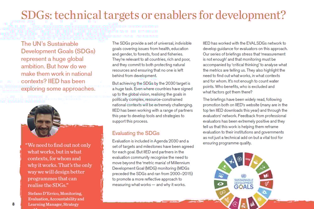 The SDGs provide a set of universal, indivisible goals covering issues from health, education and gender, to forests and food. IIED has worked with the EVALSDGs network to develop practical guides on how to evaluate progress on the SDGs. The guides have been widely read and praised. Professional evaluators report that the work is helping them reframe evaluation to their institutions and governments as not just a technical add on, but as a vital tool for ensuring programme quality.