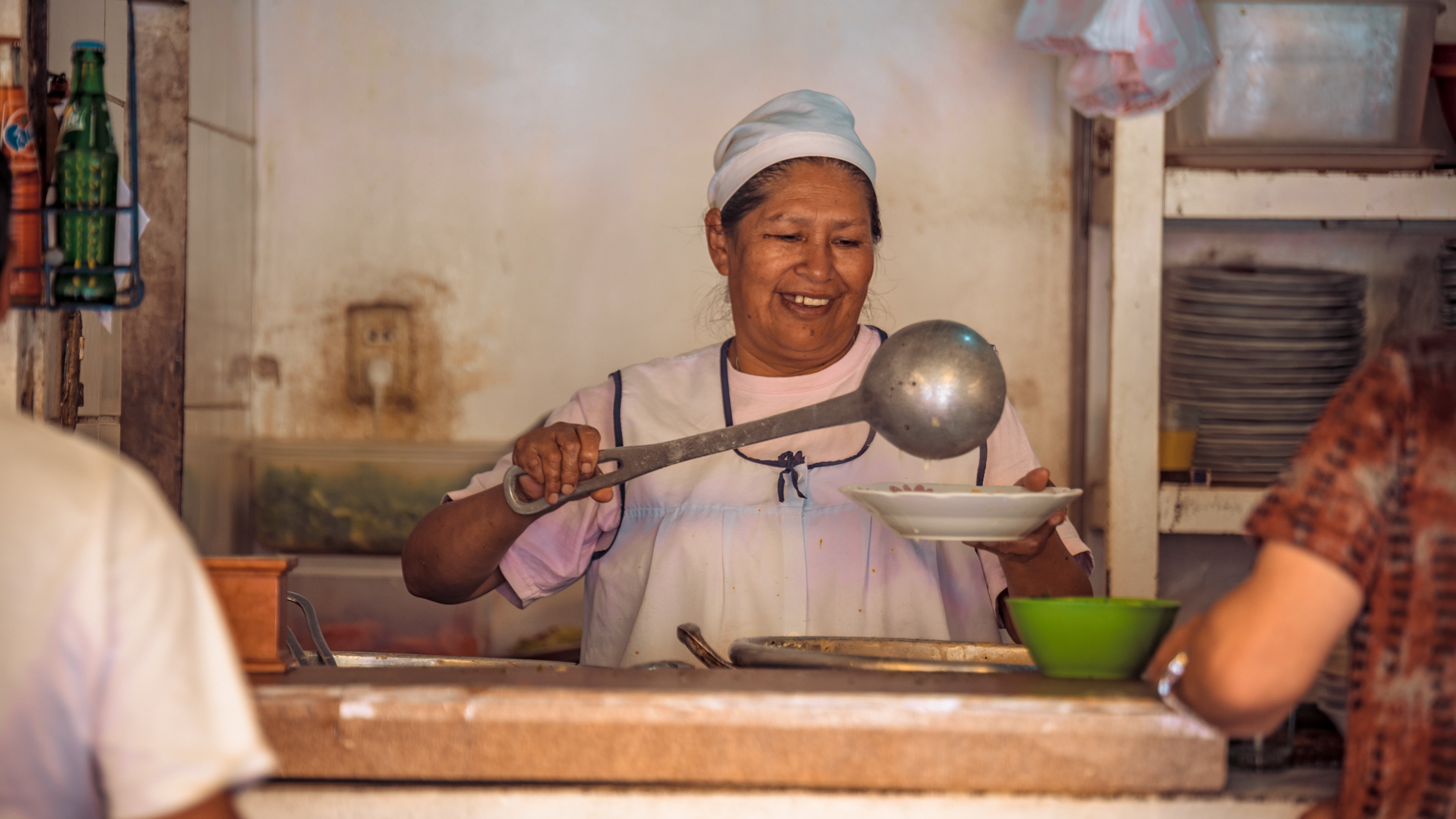 A cook serves up the daily soup at the Achumani market in La Paz (Photo: Mauricio Panoso)