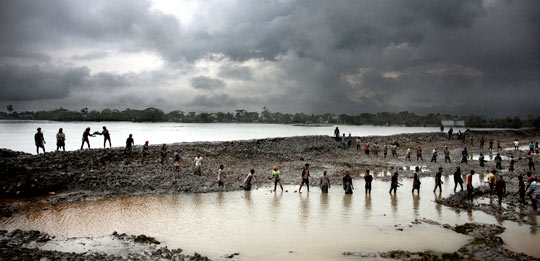 Men form a human chain to carry mud up to the embarkment. They are trying to build a new and stronger flood barrier after Cyclone Aila destroyed the old one.