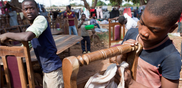 Boys polish chairs for sale in the furniture market in Nampula, Mozambique (Photo: copyright Mike Goldwater)