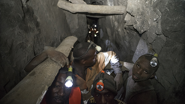 Employees work deep within a tunnel at the Nsangano Gold Mine, Mawemeru village in Geita District, Tanzania in March 2015 (Photo: Brian Sokol/Panos Pictures)