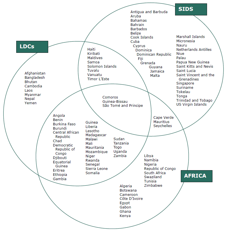 Least Developed Countries (LDCs) are the poorest countries in the world. A number of criteria determine this status. There are 48 countries in the LDC group. Roughly 65 per cent are in Africa; a number of others are known as Small Island Developing States (SIDS). Many SIDS are low-lying and located in parts of the world already prone to extreme weather events, factors that make them highly vulnerable to climate change impacts such as sea level rise and fiercer and more frequent tropical storms.