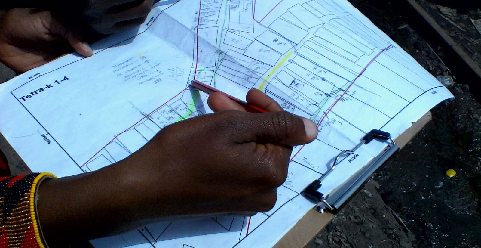 Some mapping processes go little further than this stage. They conclude by superimposing the different knowledge maps to create a composite and taking it back to the community for verification. Muungano pushed well past this stage to create hybrid maps by combining the indoor mental maps with data gathered on the ground and images captured in the sky.4