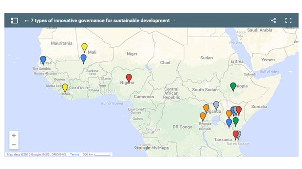 The map above points to seven tried-and-tested approaches for achieving the shift, and highlights a selection of real examples of innovative governance from around the world.