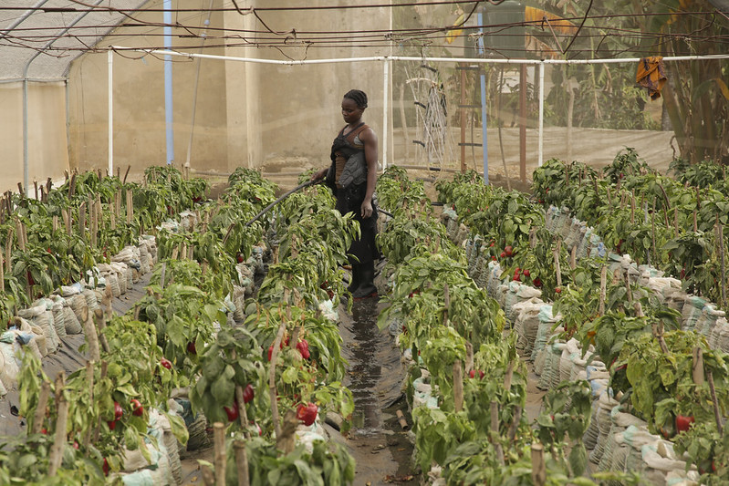 Farmer waters red peppers grown in a greenhouse in Tithokoze Farm, Mpingu, Malawi (Photo: Melissa Cooperman/IFPRI via Flickr, CC BY-NC-ND 2.0)