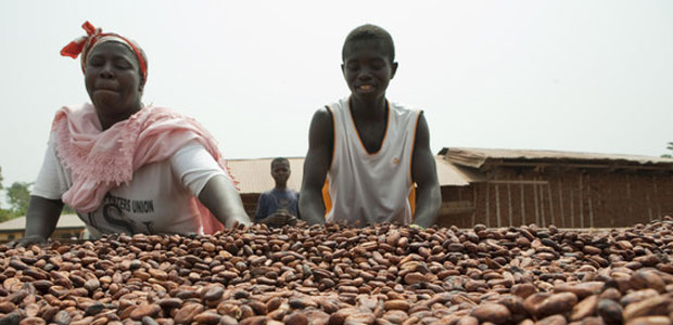 Mariama Zachary, 44, and Akua Azaiz, 20, spread drying cocoa beans on a table in Sawuah, Ghana. Photo: Flickr/Gates Foundation