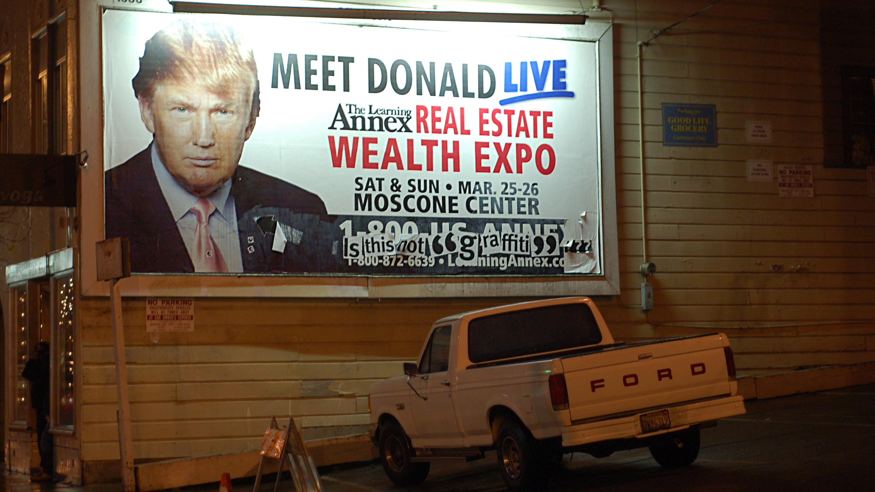 Donald Trump has long been an emblem of great wealth: this poster advertises his appearance at a "Wealth Expo" in 2006 (Photo: Steve Rhodes, Creative Commons via Flickr)