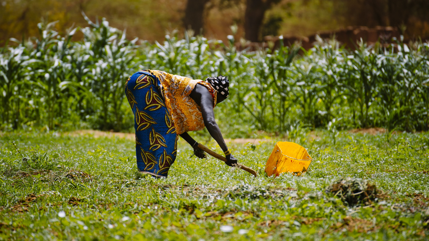 A woman farmer in Burkina Faso bends over to tend crops in a field. A new study highlights how farmers make constant decisions and trade-offs as they consider income and food needs (Photo: Ollivier Girard/CIFOR, via Flickr, CC BY-NC-ND 2.0)