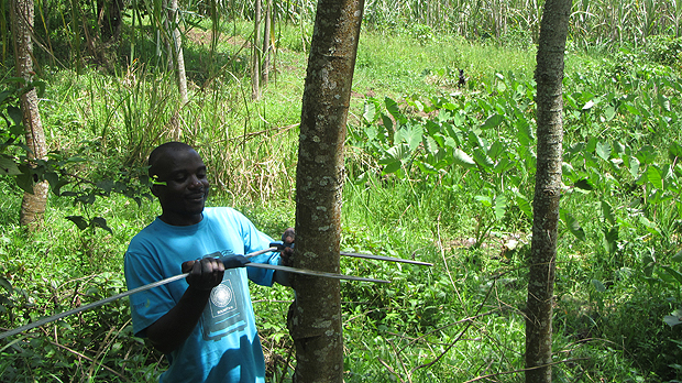 A local farmer uses manual callipers to measure a tree. Measuring trees in person can be cheaper and just as accurate (Photo: Copyright Geoff Wells)