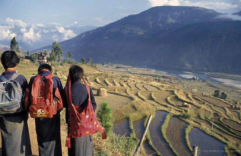 Young people look out over terraced fields in Bhutan. Youth climate initiatives are essential to drive climate action (Photo: Curt Carnemark/World Bank, via Flickr, CC BY-NC-ND 2.0)