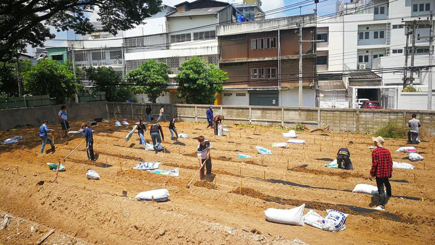 After that, we organised regular events for people to come and work together on the new urban farm: members from the Mae Kha canal communities and other informal communities in the city, members of the Chiang Mai Homeless Network, kids and teachers from nearby schools, agriculture students from the local university and families who want to share a collective garden bed.