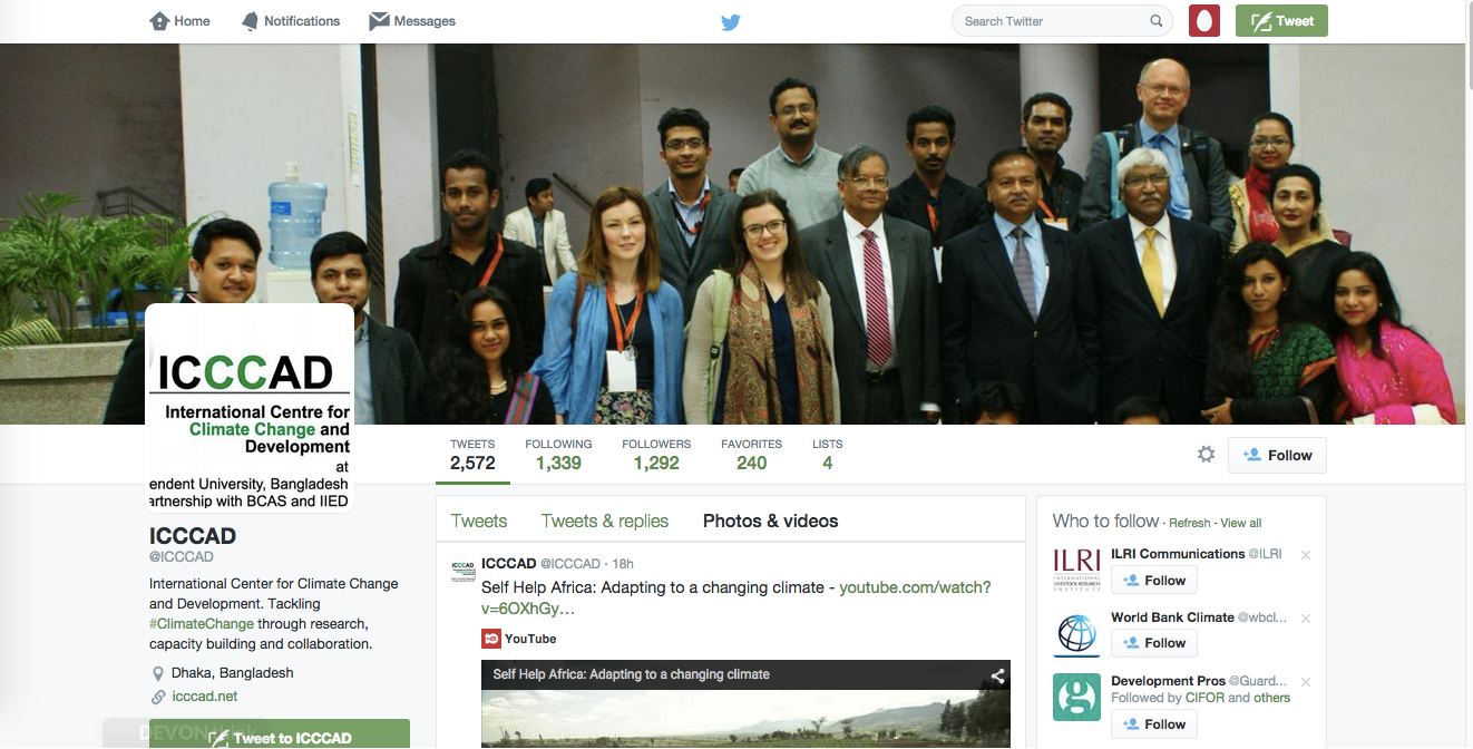 A snapshot of ICCCAD's Twitter page. Research organisations increasingly use social media platforms to communicate with their stakeholders (Image: ICCCAD)