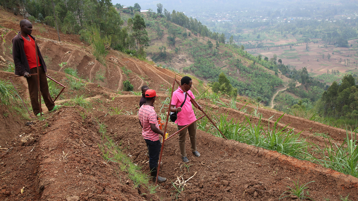 Farmers on a hillside in Rwanda consider severe erosion caused by deforestation, over cultivation and intense rainfall linked to climate change. How the Global Goal on Adaptation is measured is as important as what is measured (Photo: Rwanda Green Fund, via Flickr, CC BY-ND 2.0)