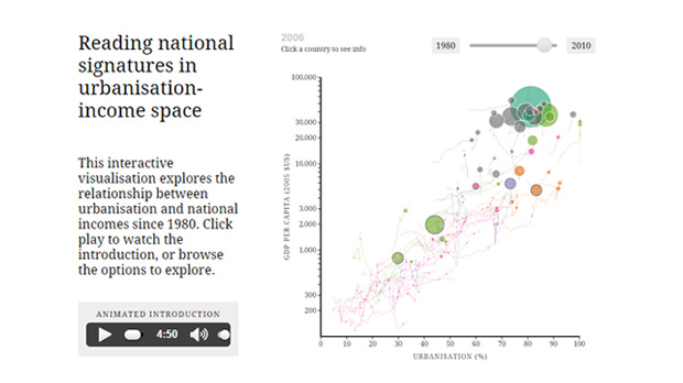 This interactive data visual examines the relationship between economic growth and urbanisation, with an introductory video focusing on the BRICS – Brazil, Russia, India, China and South Africa. It is based on research by the International Institute of Environment and Development (IIED), and a guide to its use can be found underneath the visual.