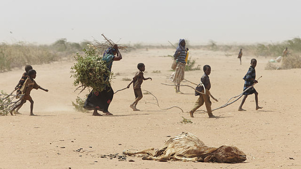 A family in Dadaab gathers sticks and branches for firewood and to make a shelter, while carcasses of animals that have perished in the drought are strewn across the desert (Photo: Andy Hall/Oxfam via Wikipedia Commons)