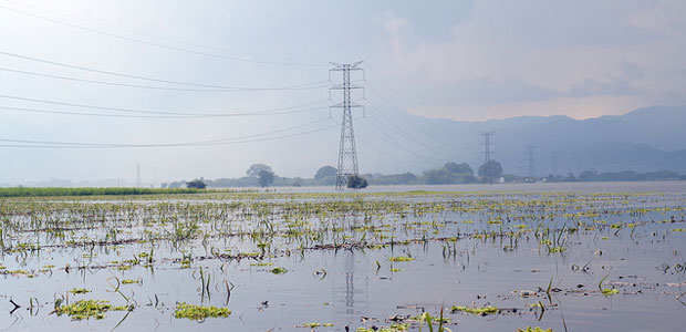 Flooded sugar cane fields near Colombia's third largest city, Cali, during an intense rainy season. Severe flooding left 2.2 million people homeless in the country in 2010. Photo: Copyright Neil Palmer (CIAT)