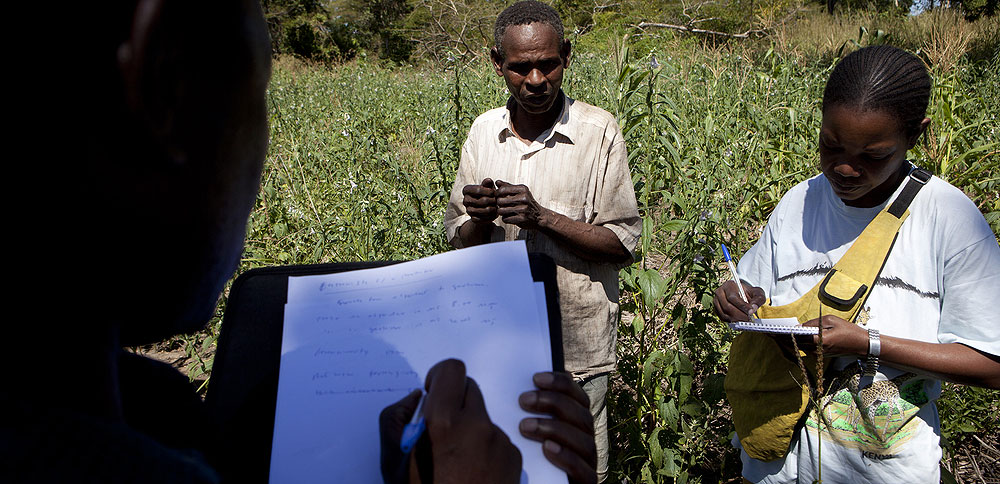 A field team designing a REDD strategy in Mozambique talk to farmer Nimale Maribu Saidi as part of their research (Copyright, Mike Goldwater)