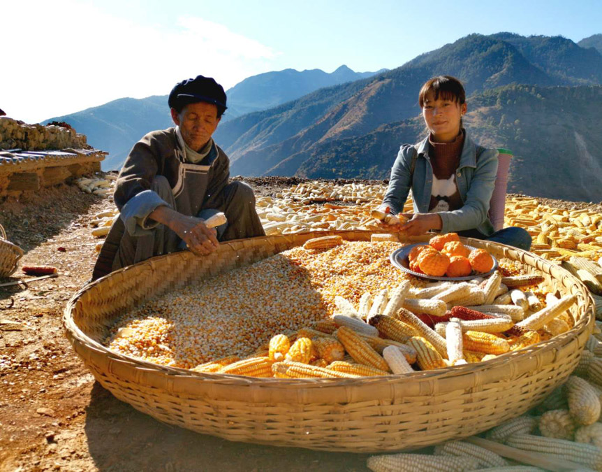 Two women collecting seeds from maize (Photo: copyright Shichun Yang)